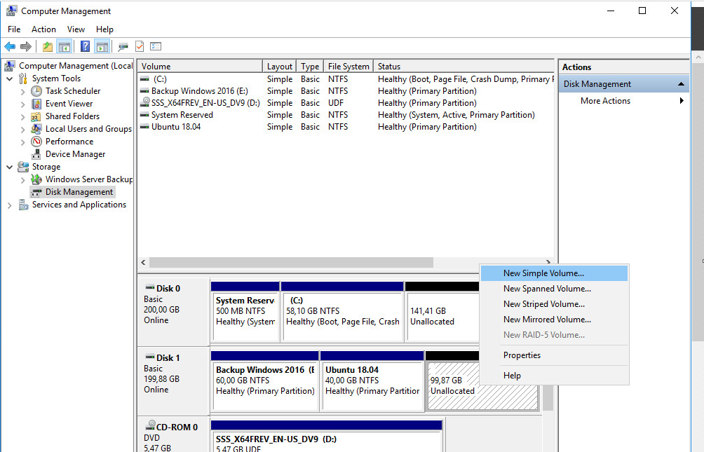 - Με δεξί κλικ δημιουργείτε μία νέα διαμέριση New Simple Volume