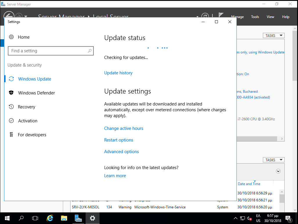 Από την εφαρμογή Server Manager επιλέγοντας Local Server και κατόπιν Download Updates only, using Windows Update θα πραγματοποιηθεί σύνδεση στο Windows Update και θα "κατέβουν" και θα εγκατασταθούν τα απαραίτητα updates.