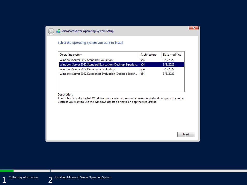 Επιλέξτε την εγκατάσταση του Windows Server 2022 Standard Desktop Experience (γραφικό περιβάλλον).