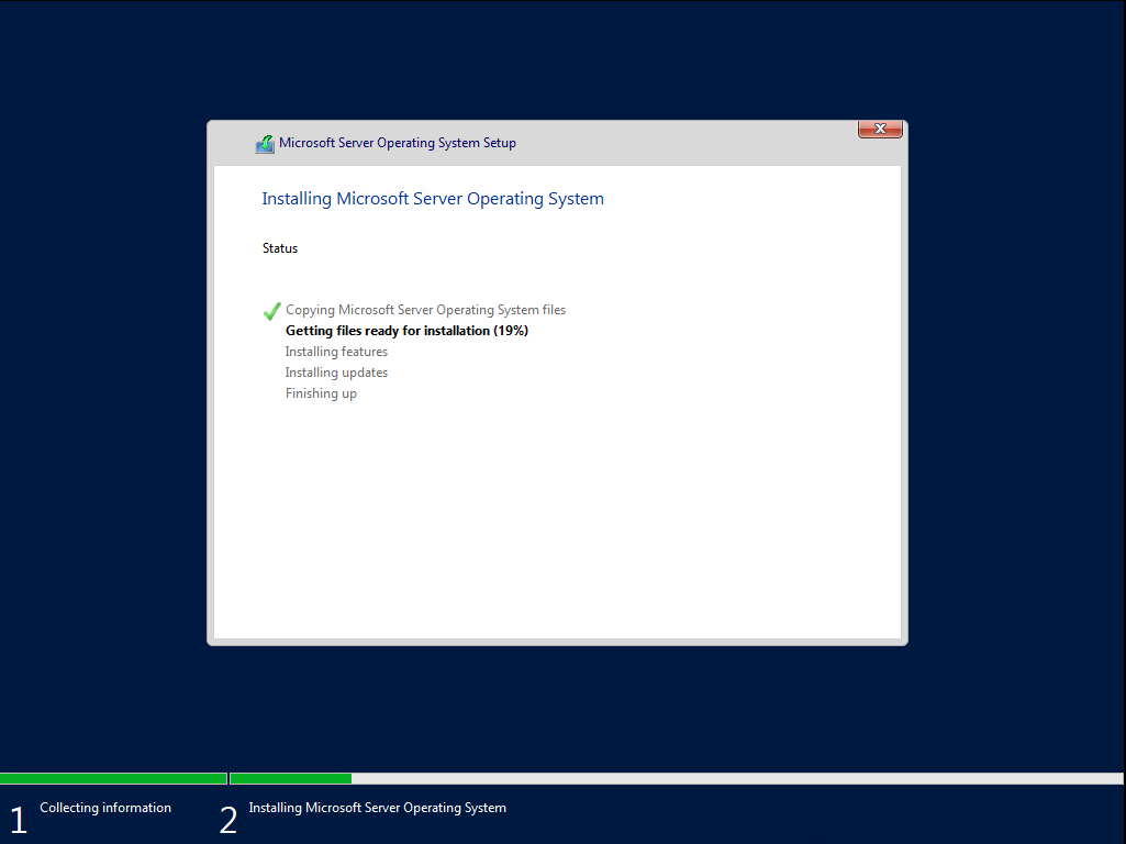 Μετά τον ορισμό των διαμερίσεων ξεκινά η αντιγραφή των αρχείων των Windows στην κατάτμηση και ακολουθεί η εγκατάσταση χαρακτηριστικών και αναβαθμίσεων.